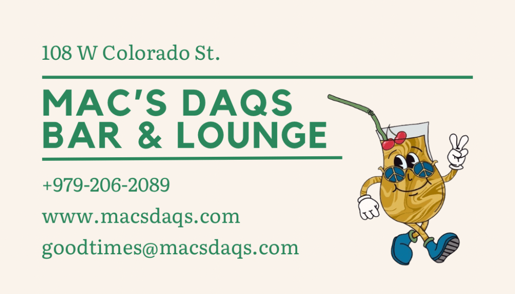 Mac’s Daqs is a fun and unique hangout spot to socialize with friends and family with 7+ frozen daiquiri flavors, a full bar, and a unique environment! We can even do private events at the bar just call us at (979) 206- 2089!